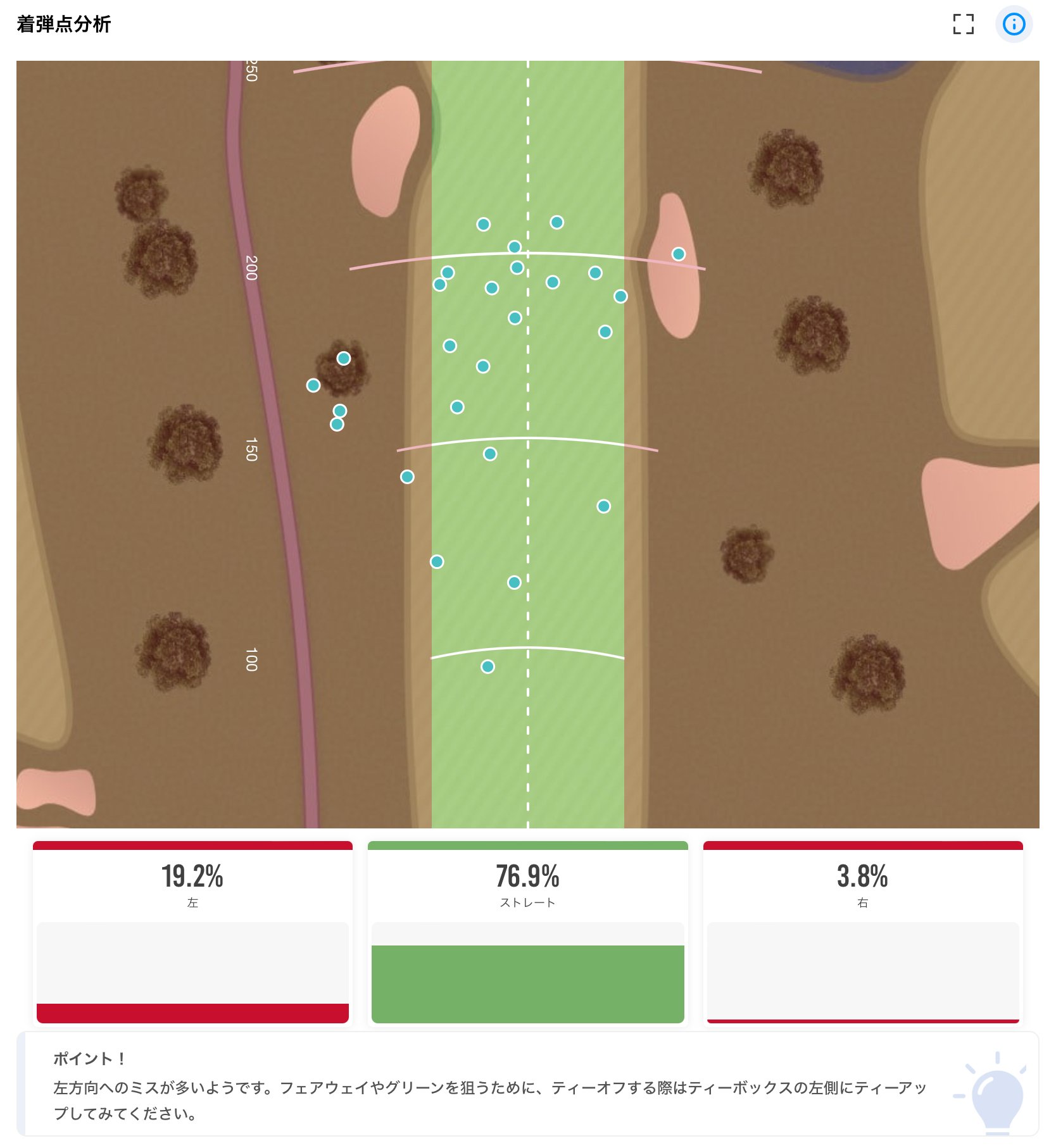 こちらがドライバーショットの解析結果です。まさに荒れ狂うドライバーショット。左右前後に乱れ打ち。